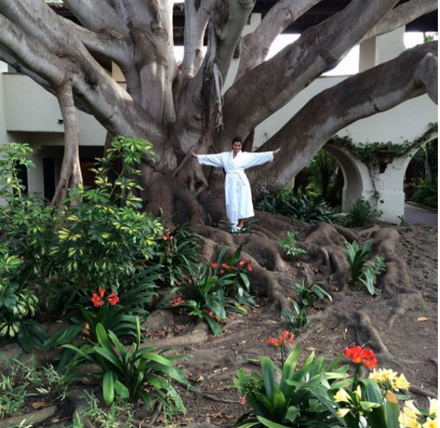 În timp ce vedeta de televiziune Kim Kardashian s-a pozat extrem de sexy , sora ei, Kourtney, a ales să-şi facă o fotografie în care apare îmbrăcată din cap până în picioare. Mai exact, într-un halat de baie alb, în timp ce stă sub un copac uriaş, iar în jur sunt o mulţime de flori.