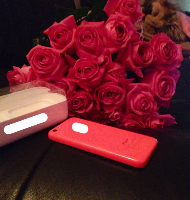 Frumoasa brunetă a primit un smartphone de ultimă generaţie şi un buchet superb de trandafiri, aşa că n-a stat prea mult pe gânduri şi le-a făcut o poză ca să le arate şi prietenilor virtuali cât de fericită e. Andreea n-a remarcat, însă, că în spate se văd şi nişte haine aruncate neglijent pe o canapea, care-i strică puţin fotografia.