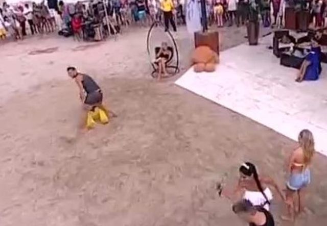 Raluca Dumitru a fost pusă la pământ de către Răzvan, în timp ce dansau, însă nu s-a văitat nicio clipă. Cei doi s-au ridicat rapid, s-au scuturat de nisip şi au dansat mai departe.