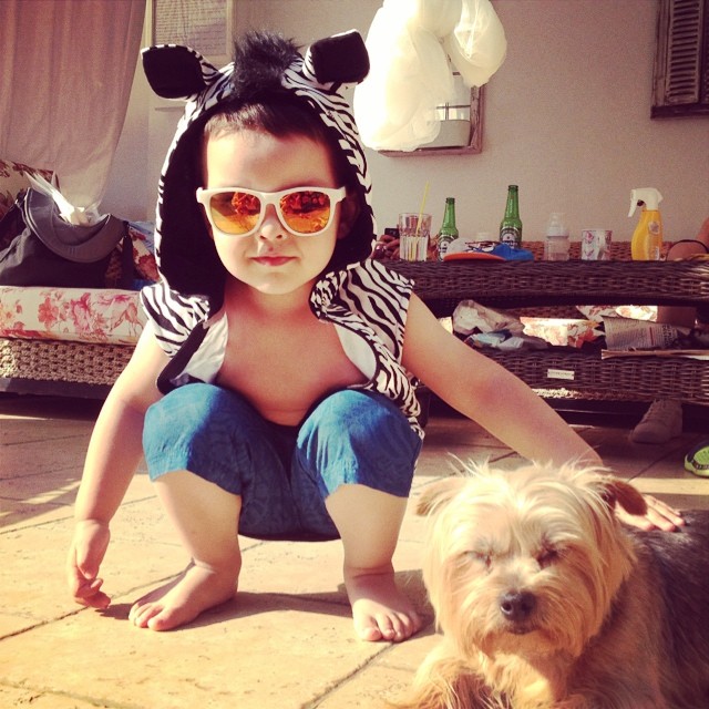 În imagine, băieţelul apare îmbrăcat într-o vestuţă cu urechi de zebră şi pantaloni scurţ. Look-ul năstruşnic al băieţelului este completat cu o pereche de ochelari la modă.