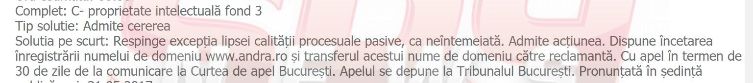 Despre acest proces, Cătălin Măruţă declara, în urmă cu un an, în exclusivitate pentru SPYNEWS: "Este vorba despre domeniul andra.ro, deţinut în acest moment de o persoană care nu îl foloseşte. Asta în condiţiile în care Andra este o marcă înregistrată în România de mai bine de 15 ani".