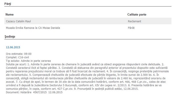 Astfel, au decis magistrații Judecătoriei Sectorului 5, s-a constatat că pârâta (adică Emilia Mușală) a săvârșit o faptă cu caracter ilicit, iar acuzațiile pe care i le-a adus lui Cătălin nu pot fi probate sub nicio formă.