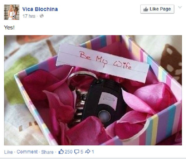 Vica Blochina a pus, în glumă, pe contul de socializare, o poză cu o cutie de cadouri colorată, plină cu petale de flori roz, în care stă un bileţel pe care scrie "Fii soţia mea". Până aici, nimic inedit, însă în cutie zace nu vreun inel de logodna cu diamant, ci... inelul de la brelocul care ţine cheile unei maşini de lux. Vica a sugerat că dacă ar primi un astfel de "inel", ar accepta pe loc cererea în căsătorie. Fosta amantă a lui Piţurcă a primit "like" de la câteva sute de fani care i-au spus că sunt de acord cu ea.