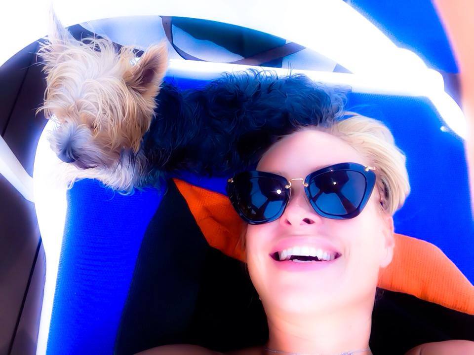 După ce s-a plictisit de atâta bălăceală, Vica s-a mutat pe şezlong, animăluţul urmărind-o şi acolo.