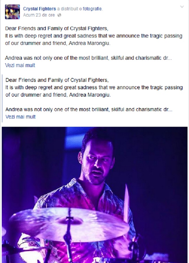 Ştirea morţii bateristului Andrea Marongiu a căzut ca un trăsnet asupra fanilor, care au fost şocaţi să citească pe reţelele de socializare un mesaj postat de colegii săi de trupă, de la Crystal Fighters.