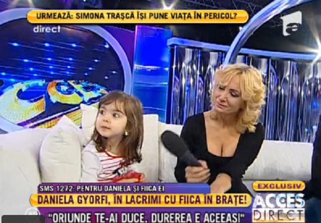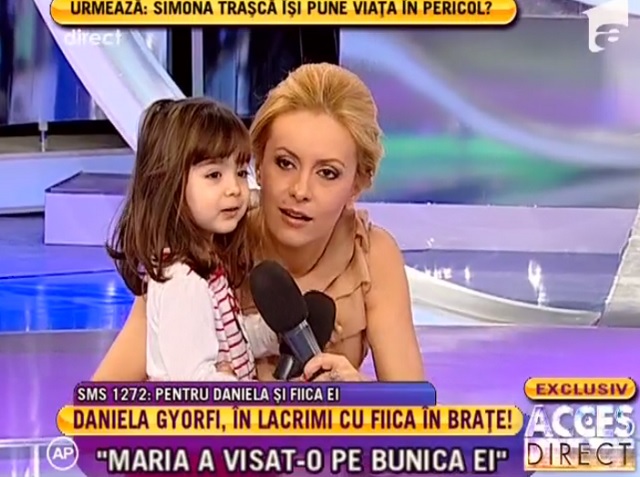 Are trei anişori şi este extrem de drăgălaşă. Maria a crescut, iar revederea dintre mamă şi fiică a fost una de-a dreptul emoţionantă. George, Daniela şi Maria au fost invitaţi în platoul emisiunii "Acces Direct". În momentul în care artista a vorbit despre visul fetiţei sale, în care a apărut mama Danielei, nu şi-a mai putut stăpâni lacrimile. Durerea încă nu a trecut, însă timpul este cel care le va vindeca pe toate.