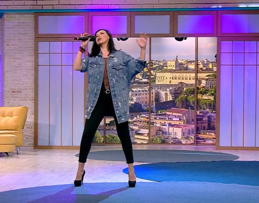 Artista a ales să îmbrace o pereche de pantaloni, o jachetă largă de blugi, iar pe dedesubt o bluză neagră transparentă în zona decolteului. Vedeta şi-a lăsat la vedere o parte din sâni şi abdomenul destul de lucrat.