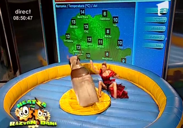 Blonda nu a mai prezentat niciodată vremea în asemenea ipostază. Flavia a luat taurul de coarne şi a încercat să spună câteva vorbe despre meteo, însă taurul s-a învârtit şi a aruncat-o pe blondă, aceasta arătându-le telespectatorilor privelişti inedite.