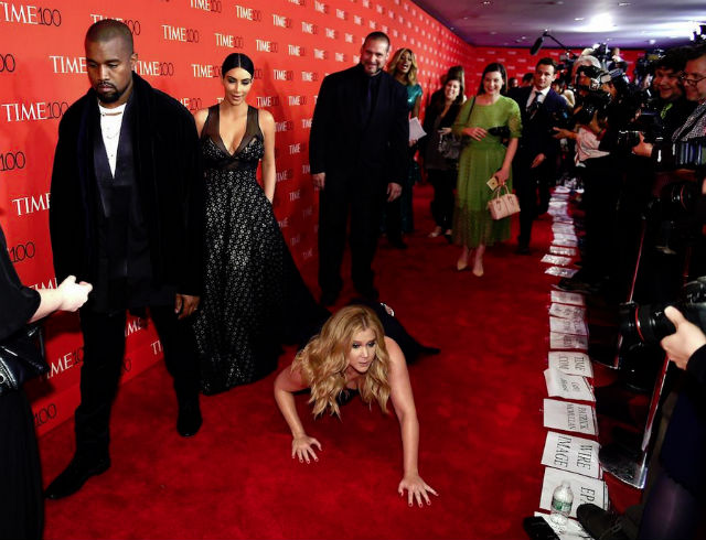 Seara nu a continuat într-un mod prea frumos. După ce au stat la poze pe covorul roşu de la gala TIME 100, cei doi au avut parte de o... păcăleală zgomotoasă. Aceasta a venit din partea actriţei Amy Schumer care s-a prefăcut că s-a împiedicat la picioarele celor doi soţi.
