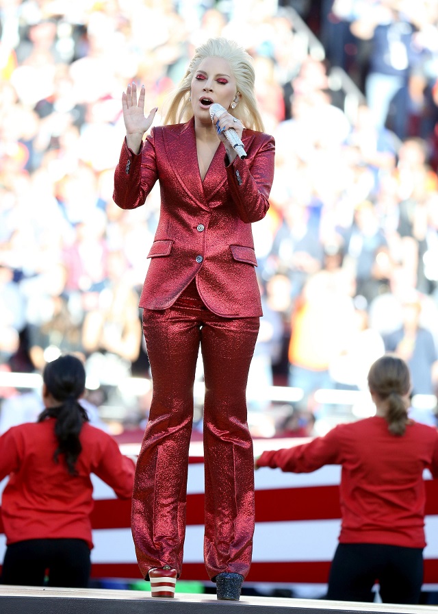 Îmbrăcată într-un costum roșu și strălucitor, Lady Gaga a cântat imnul național al Statelor Unite ale Americii și a tăiat răsuflarea tuturor. Cei prezenți au putut vedea inelul de logodnă primit anul trecut de Sfântul Valentin de la Taylor Kinney.