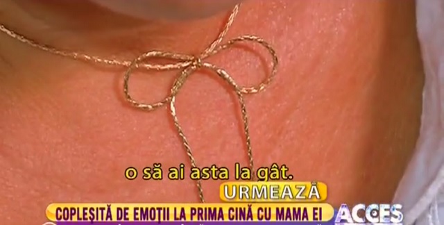 După emisiunea "Acces Direct", mama şi fiica au mers să cineze împreună. Încă aveau multe să-şi împărtăşească. La un moment dat, Monica a vrut să-i dăruiască fiinţei care a adus-o pe lume, un dar din suflet. Şi-a scos lănţişorul de la gât şi i l-a oferit mamei sale. Momentul emoţionant a făcut-o pe femeie să lăcrimeze.