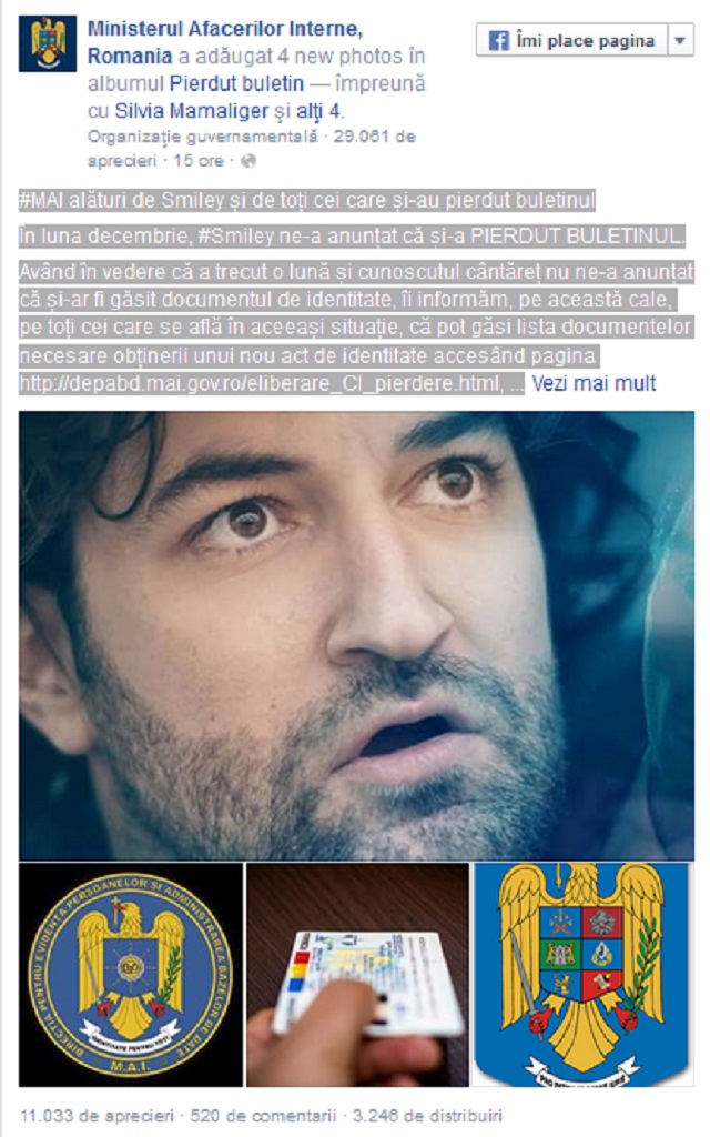 Având în vedere că a trecut o lună și cunoscutul cântăreț nu ne-a anunțat că și-ar fi găsit documentul de identitate, îi informăm, pe această cale, pe toți cei care se află în aceeași situație, că pot găsi lista documentelor necesare obținerii unui nou act de identitate accesând pagina http://depabd.mai.gov.ro/eliberare_CI_pierdere.html, ...",
