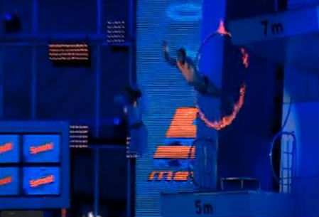 Deşi săritura a fost în apă,a cei doi au trecut printr-o probă de foc, la propriu. Vladimir Drăghia a dat dovadă de curaj şi a sărit printr-un cerc împrejmuit cu foc.