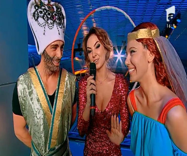 Vladimir Drăghia şi Sore au sărit împreună de la înălţimea de 5 metri, nu înainte de a-şi face intrarea pe trambulină, ca nişte adevăraţi sultani. Aceştia s-au deghizat în Suleyman Magnificul şi iubita acestuia, frumoasa Hurrem.