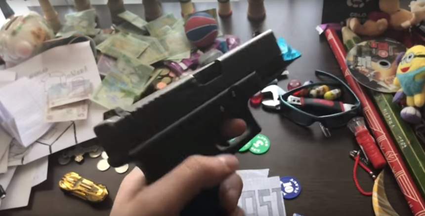 Recent, acesta s-a filmat, însă, în timp ce se lăuda cu noile sale „jucării”: un pistol tip airsoft şi un tub de cartuş de vânătoare de 12 mm, care are un regim aparte şi nu trebuie să ajungă pe mâna oricui.