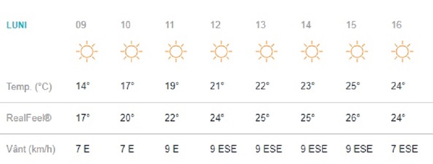 Dimineața de luni îi surprinde pe bucureșteni cu 14 grade în termometre, urmând ca odată cu trecerea orelor, temperaturile să crească. La ora 10:00 vor fi 17 grade, la ora 11:00 temperaturile vor crește și vor ajunge la 19 grade, iar la ora 12 se vor înregistra 21 grade resimţite aproape ca 24 grade.