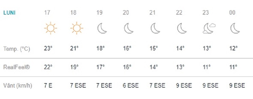 De la ora 16:00, temperaturile încep să scadă ușor de la maxima atinsă de 25 de grade. La ora 17:00 termometrele vor indica 23 grade Celsius, iar la ora 18:00 se vor înregistra 21 de grade Celsius.