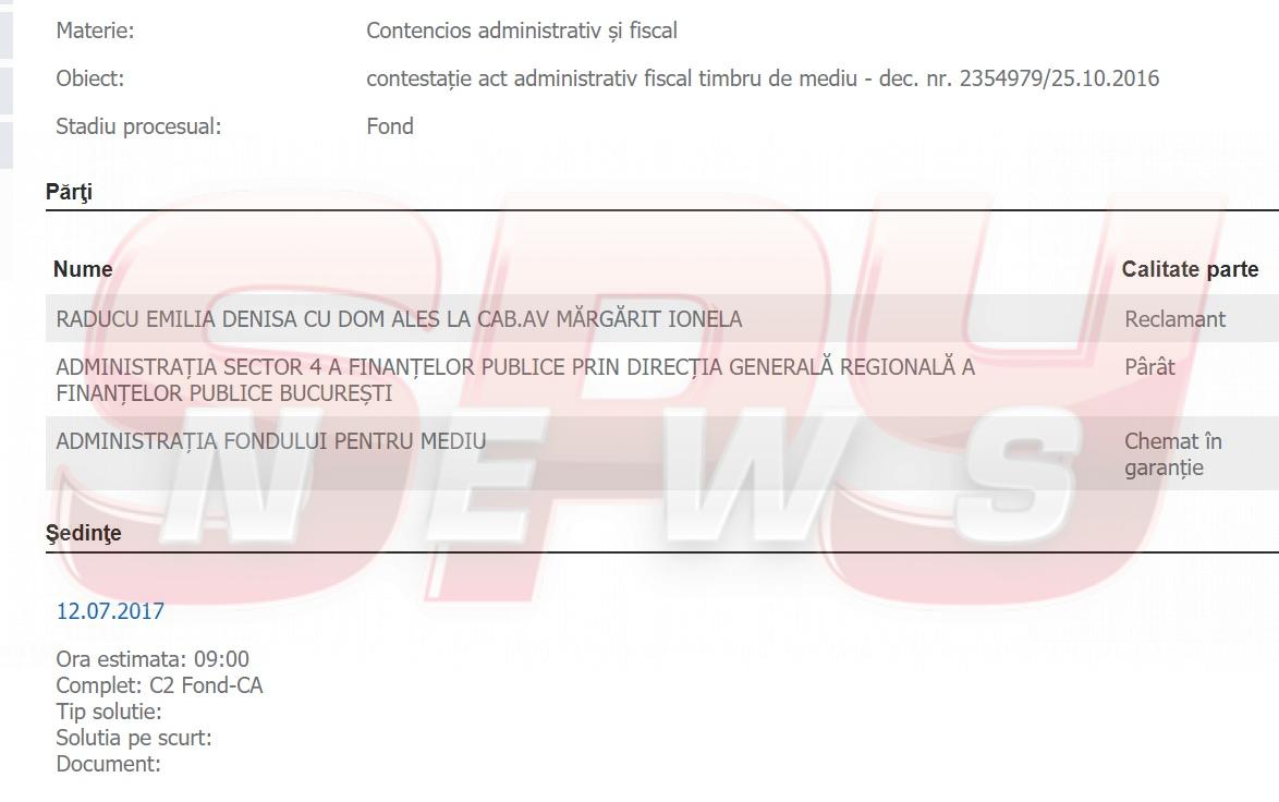 Denisa este aşteptată miercuri, la ora 9.00, la Tribunalul Bucureşti, unde se va judeca procesul deschis chiar de ea împotriva Finanţelor Publice şi Administraţiei Fondului pentru Mediu. Denisa - personal sau prin împuternicit - trebuie să demonstreze că a achitat taxa de poluare şi, după ce vor analiza documentele, judecătorii vor putea da un verdict. Surse din anturajul artistei au dezvăluit că suma pe care Denisa încearcă să o recupereze se ridică la aproximativ 4.000 de euro, bani de care aceasta are nevoie pentru medicamente şi investigaţii.