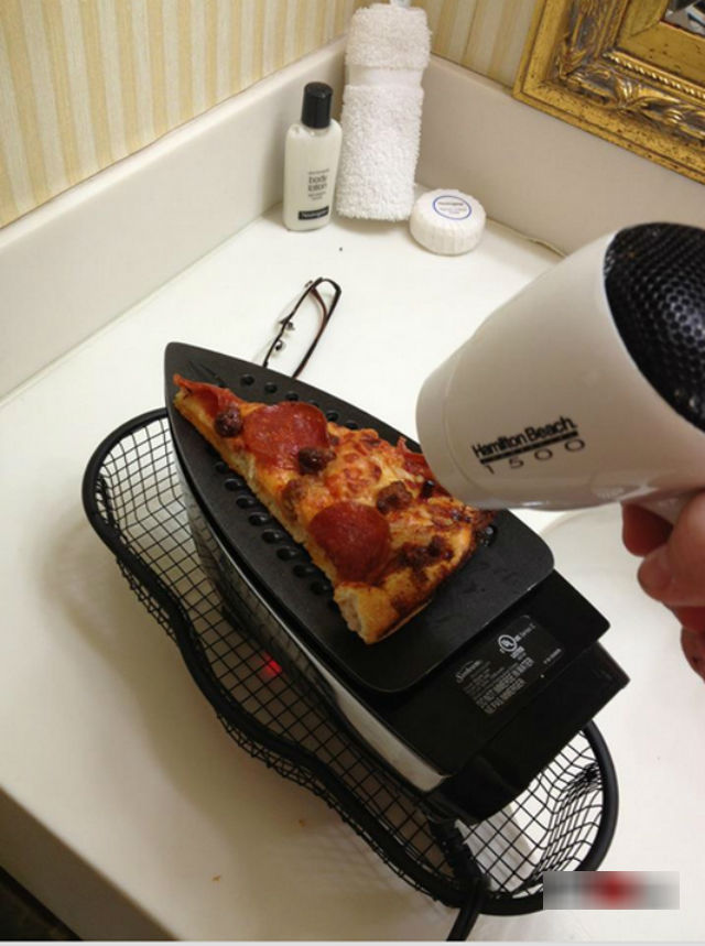 Bărbatul a încins un fier de călcat, la întors cu talpa în sus şi apus pe el felia de pizza. Nu s-a oprit aici. Ca să fie sigur că mâncare va fi fierbinte cât mai curând, el s-a folosit şi de uscătorul de păr pentru a o încălzi. Ai face aşa ceva?