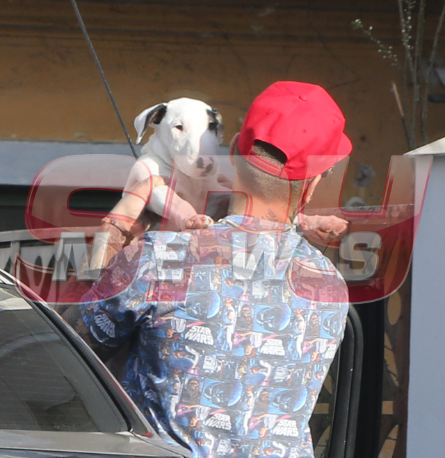 Astfel, după ce a coborât din mașină, Alex Velea și-a luat cățelușul pe care îl are, un bull-terrier care pare să aibă un comportament de pisică și, fără să îl lase vreo secundă din brațe, s-a plimbat puțin pe stradă cu el, iar apoi, a decis că este cazul să își răsfețe puțin iubitul patruped.