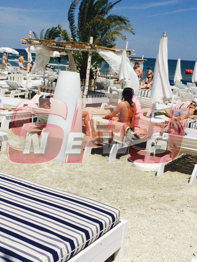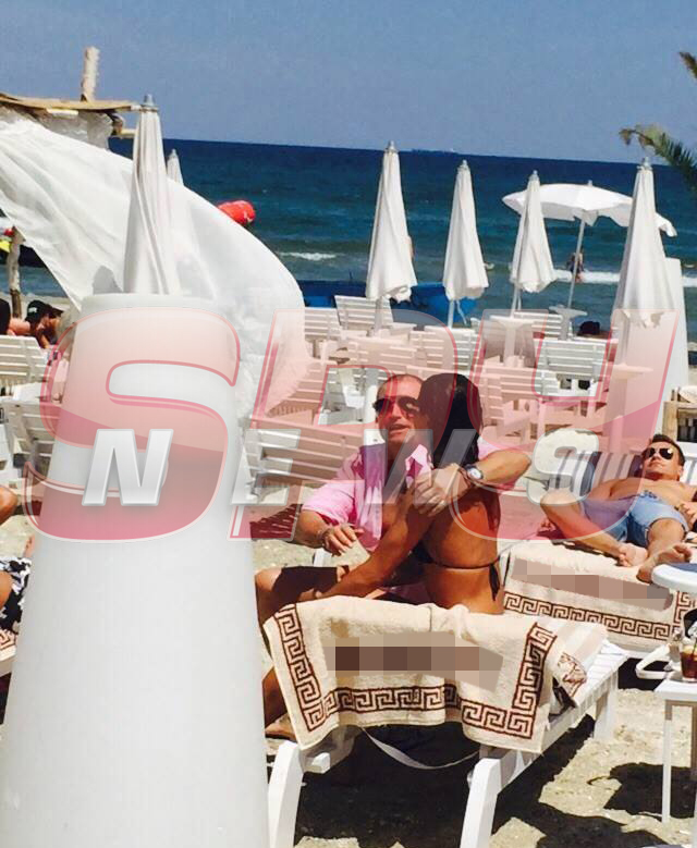 Designerul nu s-a afişat în slip, însă nu şi-a neglijat apariţia de pe nisipul fin. Îmbrăcat cu o cămaşă roz, cu ochelari de soare şi cu accesorii de lux la mâini, Bote a stat la poveşti minute bune cu misterioasa brunetă pe care, la un moment dat, a luat-o în braţe.