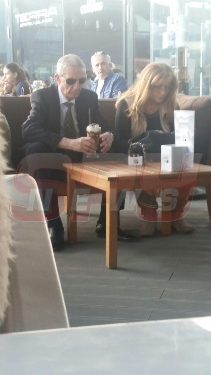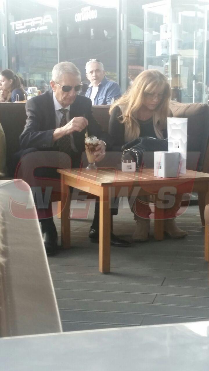 Îmbrăcat la patru ace, fostul general a vorbit mai tot timpul la telefon. Nu a stat însă prea mult timp singur și, la masă, i s-a alăturat o blondă care, preocupată, tot căuta și ea ceva în mobilul ei. Cei doi au petrecut acolo mai bine de o oră, lâncezind încântați de vremea bună și sorbind din când în când din cafelele așezate în fața lor, vorbinnd sporadic, iar apoi au plecat împreună spre următoare lor destinație.