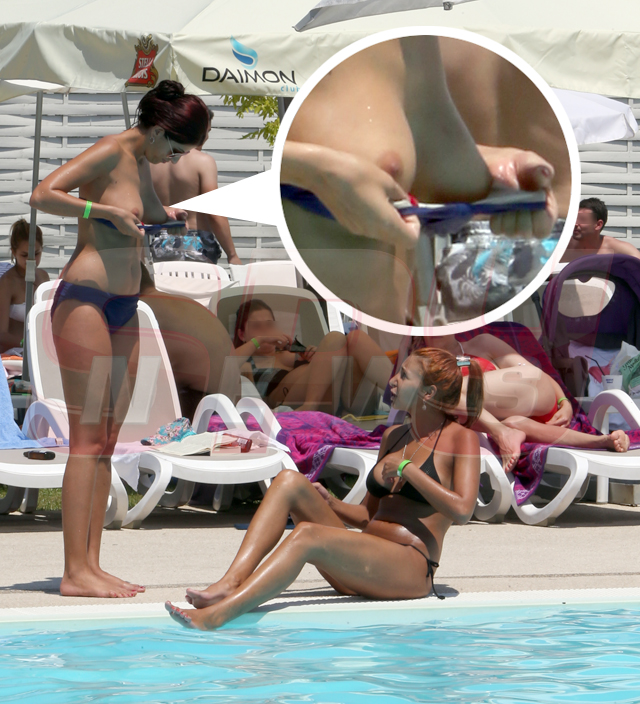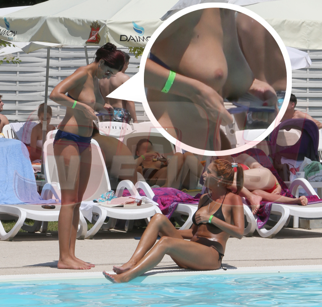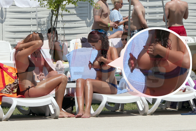 Într-un costum de baie minuscul, de culoare bleumarin, cântăreaţa şi-a uns pielea deja bronzată, a râs şi s-a jucat în apă, dar a lăsat să-i scape şi sânii pe afară.