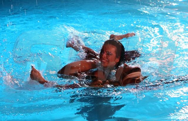 Disperată, Denisa dădea din picioare, încercând să se elibereze și să își scoată, astfel, capul deasupra apei. Mai puternică însă, bruneta și-a impus voința și, după ce a repetat de câteva ori figura, cu un zâmbet încântat, i-a dat drumul Denisei care, de acum, îi știe de frică că frumoasei sale colege de platou și încerca, disperată, să își recapete suflul.