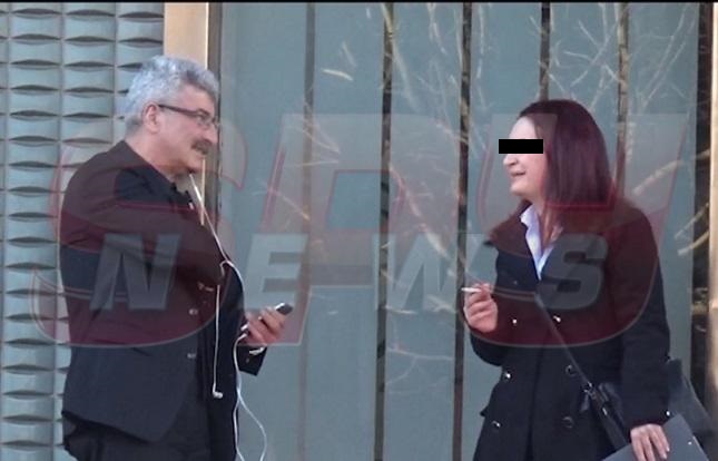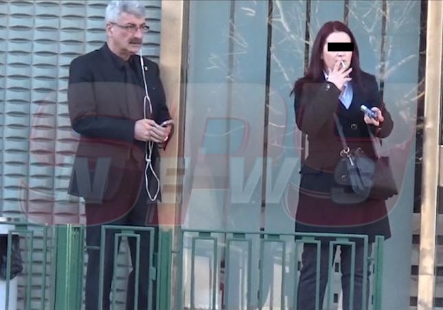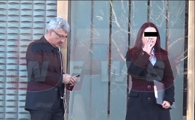 Omul de afaceri a fost surprins în faţa clădirii Institutului Diplomatic Român. Singur, sprijinindu-se de intrarea instituţiei, aparent fixat pe "ceva" din telefonul său mobil. La nici doi metri de el, o tânără fuma de zor, furată de peisajul de pe B-dul Primăverii.
