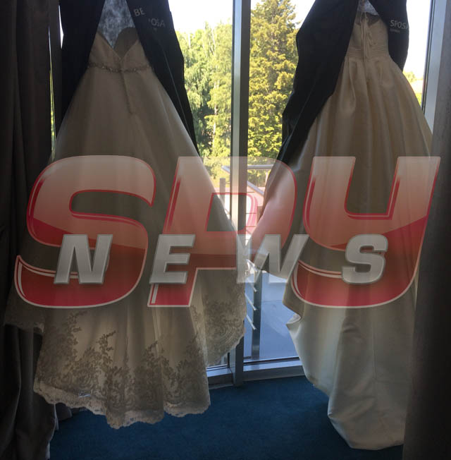 Una dintre ele, decoltată și lungă, iar cea de-a doua, scurtă în partea din față, dar cu o trenă lungă urmează să fie îmbrăcate imediat după ce tot ce înseamnă machiaj și coafură.