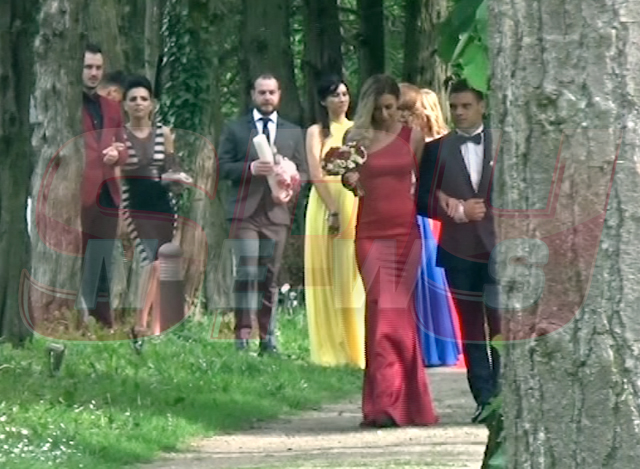 Stelistul Adi Popa şi-a făcut apariţia la braţul naşei, care a reuşi să fure toate privirile, într-o rochie lungă, roşie. Mirele a ales pentru marele eveniment un costum simplu şi elegant de culoare neagră, la care a asortat un papion de aceeaşi culoare.