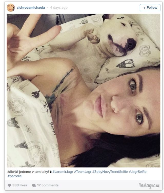 Mulţi utilizatori de Instagram au început să posteze poze în care îi copiază gestul victoriei, dar în selfie nu mai apare Jagr, ci un câine, un ursuleţ de pluş, sau un poster cu jucătorul ceh.