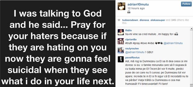 "Am vorbit cu Dumnezeu şi El mi-a spus: Roagă-te pentru duşmanii tăi, pentru că dacă te urăsc acum vor dori să se sinucidă după ce vor vedea ce am planuit pentru tine în viitor", este mesajul publicat de Mutu pe Instagram.