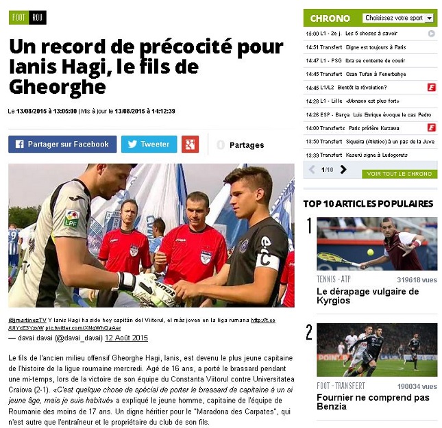 Publicaţia franceză "L'equipe" a scris despre Ianis Hagi, fiul lui Gică Hagi, numit căpitan al Viitorului Constanţa.