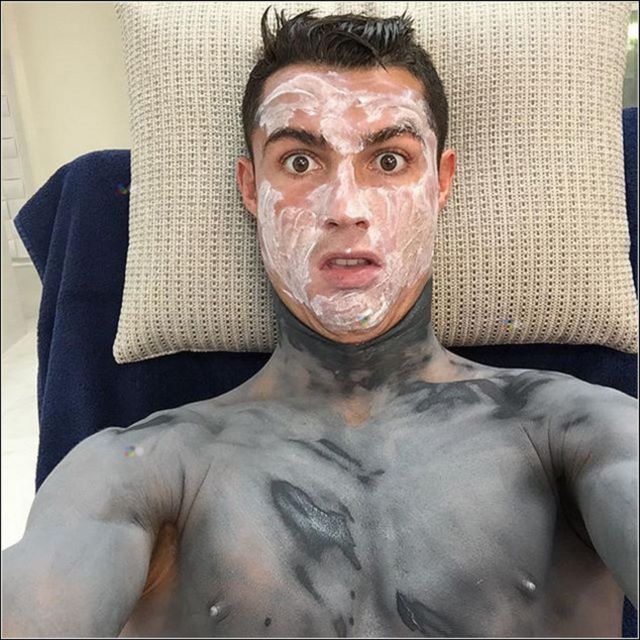 Starul celor de la Real Madrid a postat pe contul său de Instagram o fotografie în care apare gol, mâjit pe faţă cu o mască, iar pe corp cu pastă neagră care seamănă cu nămolul.