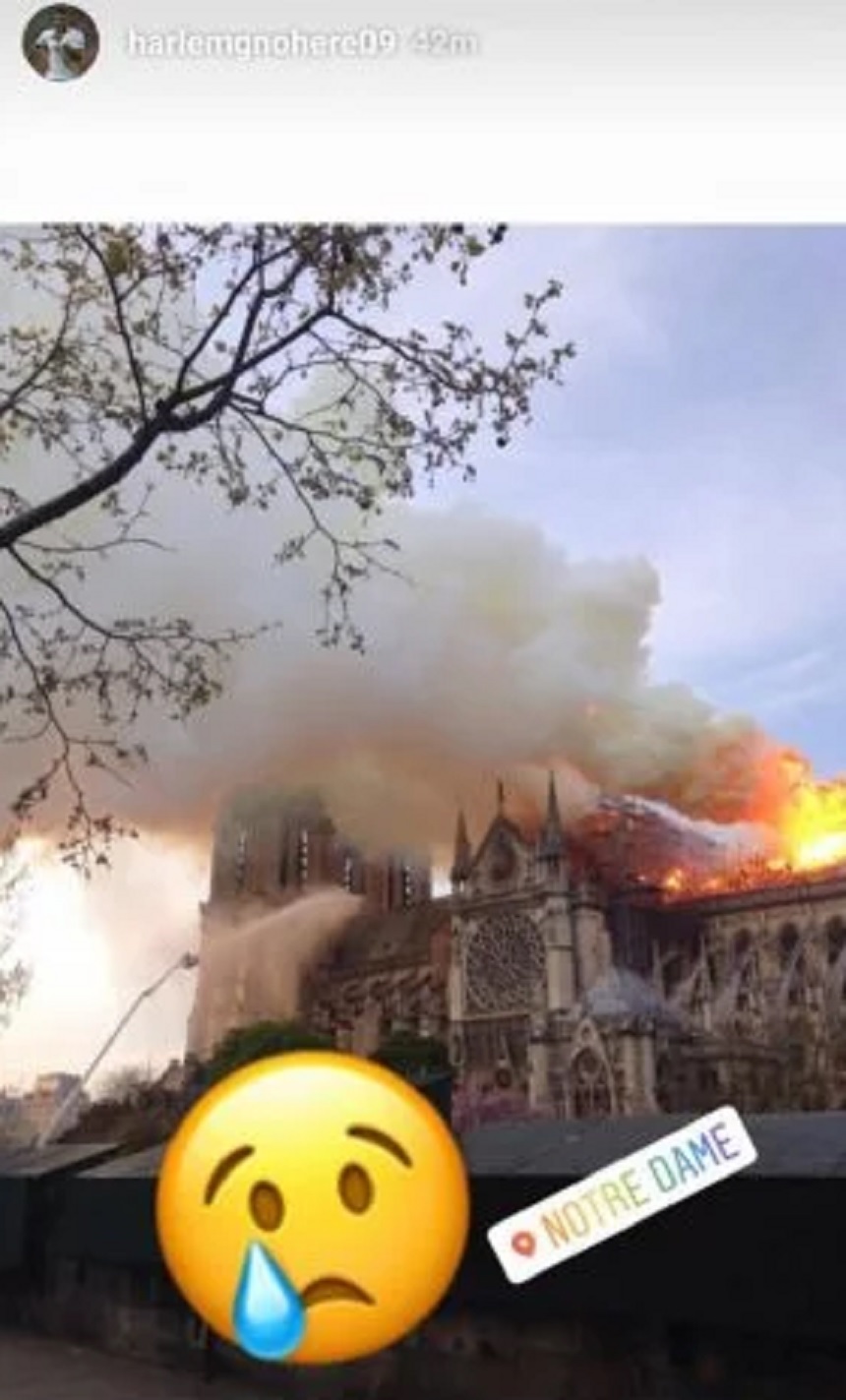 Imediat cum a aflat că monumental istoric vechi de peste 850 de ani arde ca o torță, “Bizonul” a reacționat. Pe Instagram, Harlem Gnohere a postat o fotografie cu Catedrala Notre-Dame în flăcări. Lângă aceasta, atacantul a pus o lacrimă.