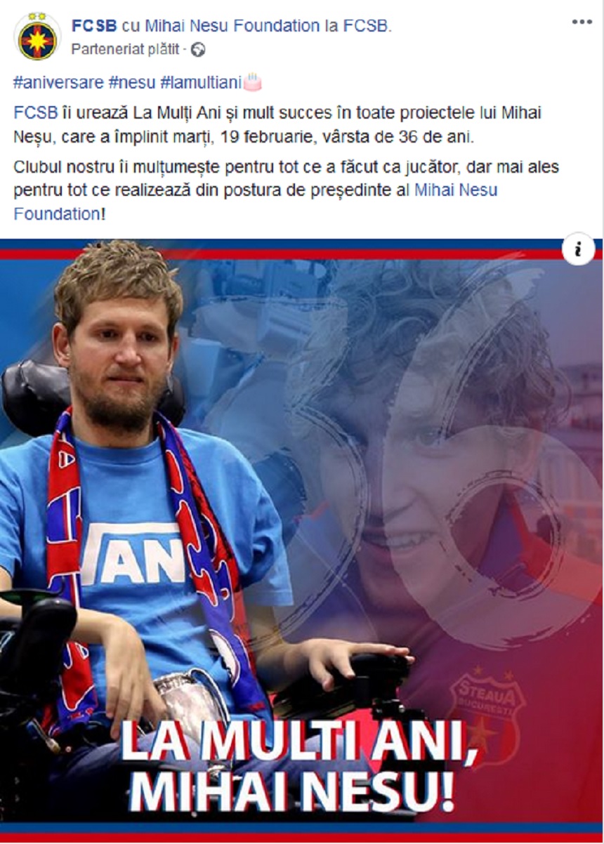 Clubul nostru îi mulțumește pentru tot ce a făcut ca jucător, dar mai ales pentru tot ce realizează din postura de președinte al <<Mihai Nesu Foundation>>”.