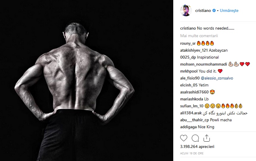 Cristiano Ronaldo și-a etalat, din nou, fizicul impresionant, după ce acum câteva zile mai postase pe Instagram o altă imagine care îi scotea în evidență calitățile. Acum, fotbalistul portughez a postat o poză cu spatele, în care și-a etalat masa musculară impresionantă. "Fără cuvinte!", a fostmesajul care a însoțit fotografia respectivă.