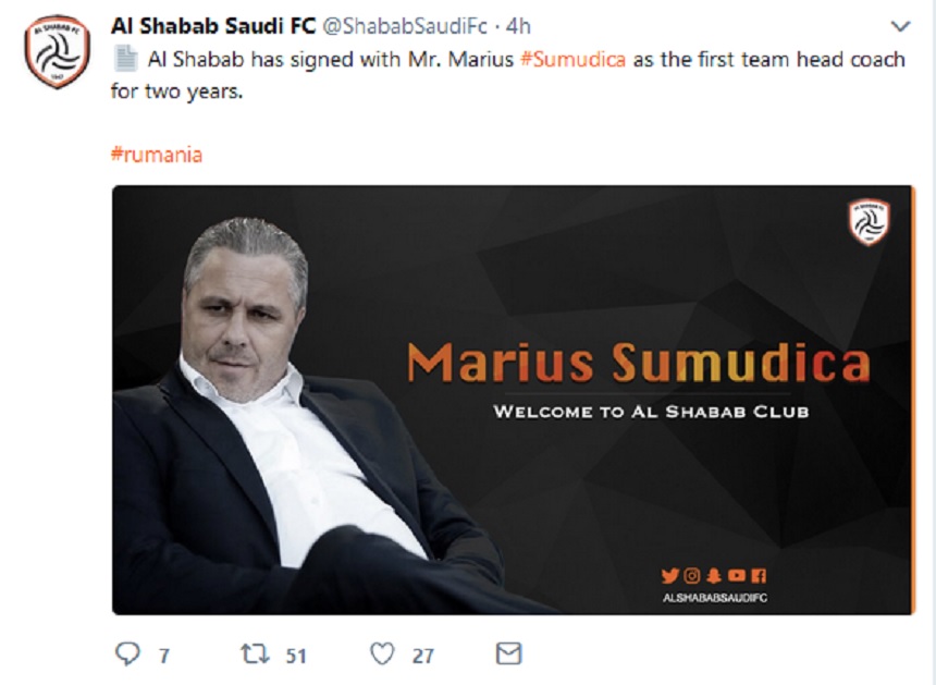 Marius Şumudică (47 de ani) este noul antrenor al echipei Al Shabab FC , conform unui anunț făcut pe contul de Twitter al grupării din Arabia Saudită.