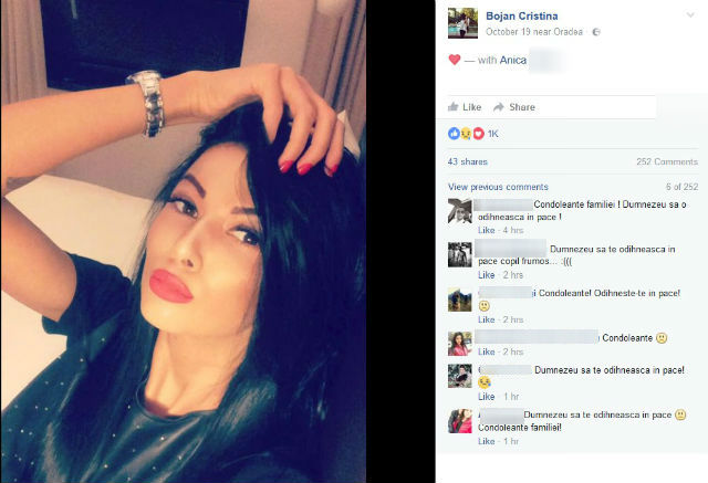 "Dumnezeu să te odihnească în pace!!", "Te iubim, prinţesă!" şi "Condoleanţe! Dumnezeu să te odihnească în pace!" sunt doar trei dintre mesajele care au apărut la scurt timp pe pagina de Facebook a Cristinei Bojan.