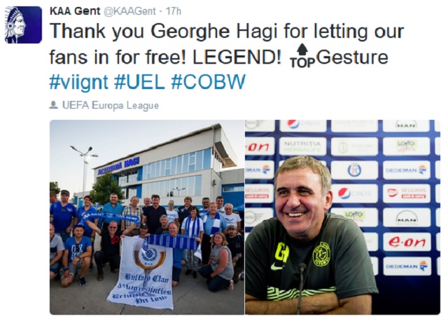 „Îți mulțumim, Gică Hagi pentru că i-ai lăsat pe suporterii noștri să intre gratis pe stadion. Ești o legendă!”, a fost scris pe contul de Twitter al grupării belgiene.