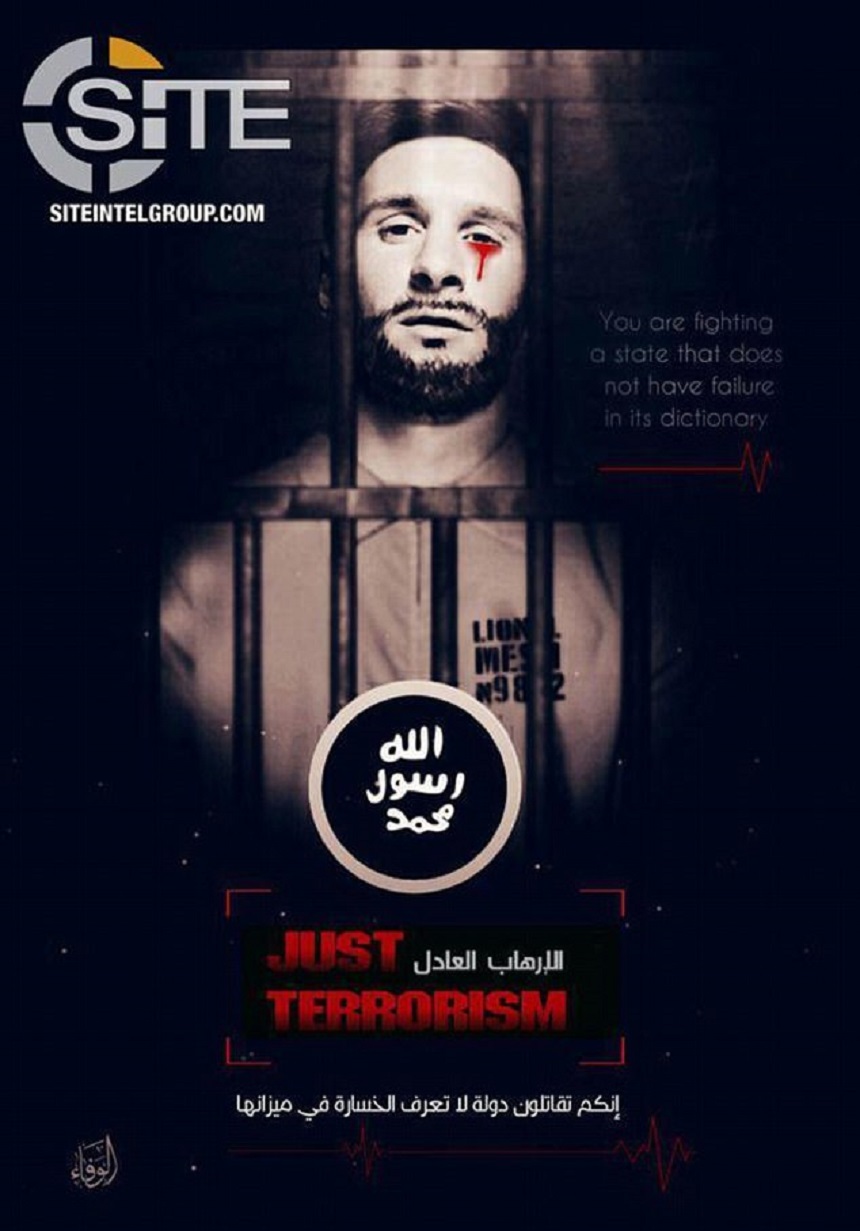 ISIS a publicat o fotografie cu starul Barcelonei după gratii, cu lacrimi de sânge și un mesaj amenințător. “Vă luptați cu un stat care nu are cuvântul eșec în dicționar”, stă scris pe afişul respectiv.