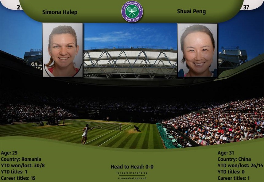 Simona Halep (25 de ani), locul 2 WTA, o va întâlni, azi, după ora 15:30, în turul al III-lea de la Wimbledon, pe chinezoaica Shuai Peng (31 de ani), poziţia 37 mondial. Cele două sportive nu s-au mai aflat faţă în faţă până acum.