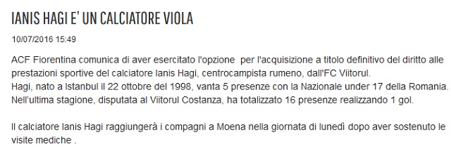Hagi junior a devenit oficial jucătorul Fiorentinei. Clubul viola a anunţat, astăzi, pe site-ul oficial, că a activat clauza de transfer a mijlocaşului Viitorului.