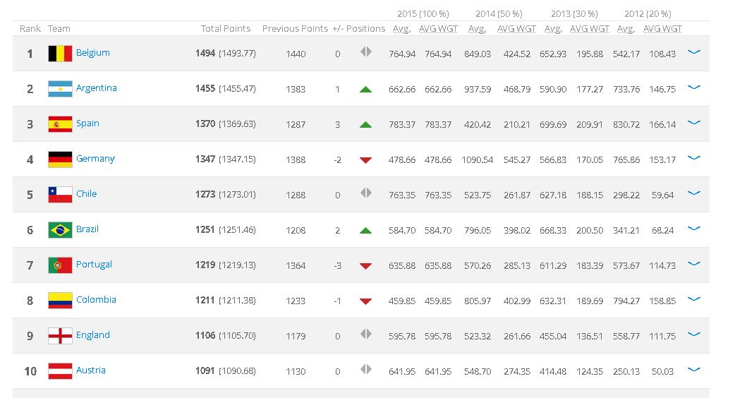Lider este Belgia, cu 1494 de puncte. Primele zece locuri în clasamentul FIFA sunt ocupate de următoarele reprezentative.