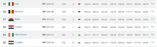 Cu doar 980 de puncte România a pierdut două poziţii şi a ajuns pe locul 16, între Italia şi Ţara Galilor.