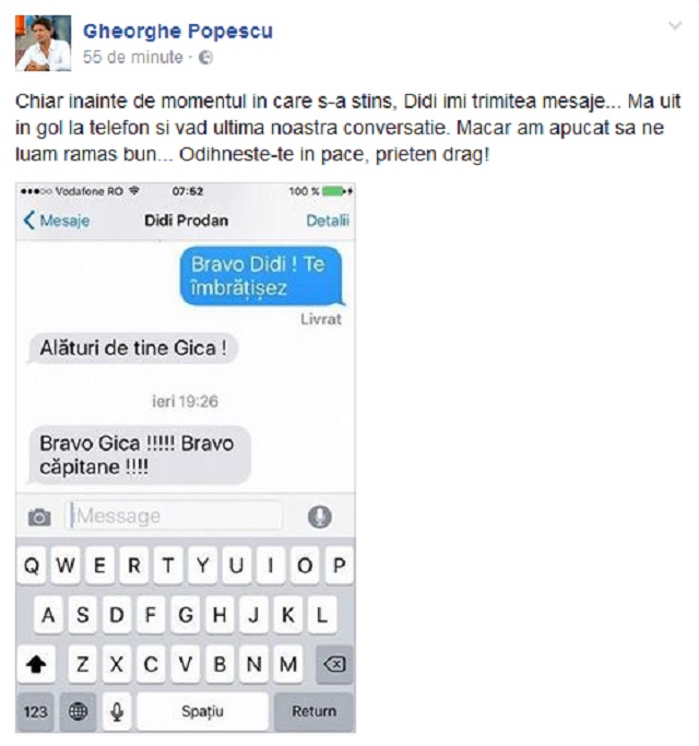 “Bravo, Gică!!! Bravo, căpitane!!!", i-a transmis Didi Prodan fostului căpitan al “Generației de Aur”, i-a scris Prodan lui Gică Popescu, miercuri seara, la ora 19:26, cu aproximativ 30 de minute înainte să se stingă.
