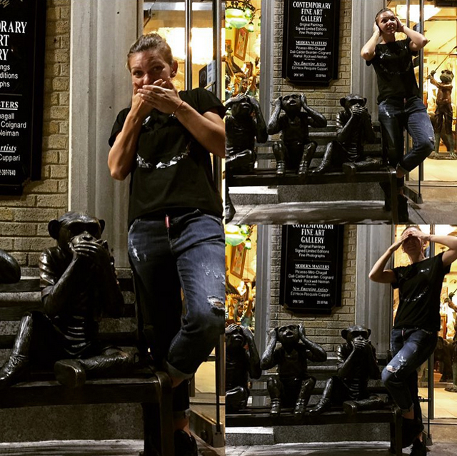 A mers la o şedinţă foto, a acordat interviuri amuzante, a participat la o filmare cool făcută de americani şi, nu în ultimul rând a ieşit seara la un local tipic american în faţa căruia şi-a făcut nişte poze super haioase. Îmbrăcată ştrengăreşte, cu blugii rupţi în genunchi, Simona a imitat poziţia unei statuete din bronz care întruchipa o maimuţă.