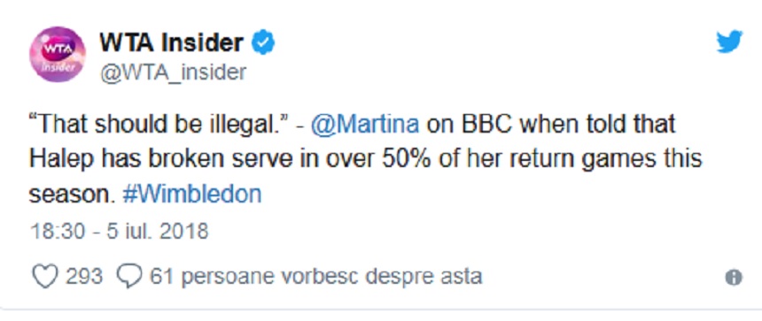 Fosta câştigătoare a 18 turnee de Mare Şlem, Navratilova a avut o reacție uluitoare când a aflat că Simona Halep a făcut break în peste 50% din game-urile în care s-a aflat la retur. “Asta ar trebui să fie ilegal”, a exclamat fosta mare sportivă la BBC.