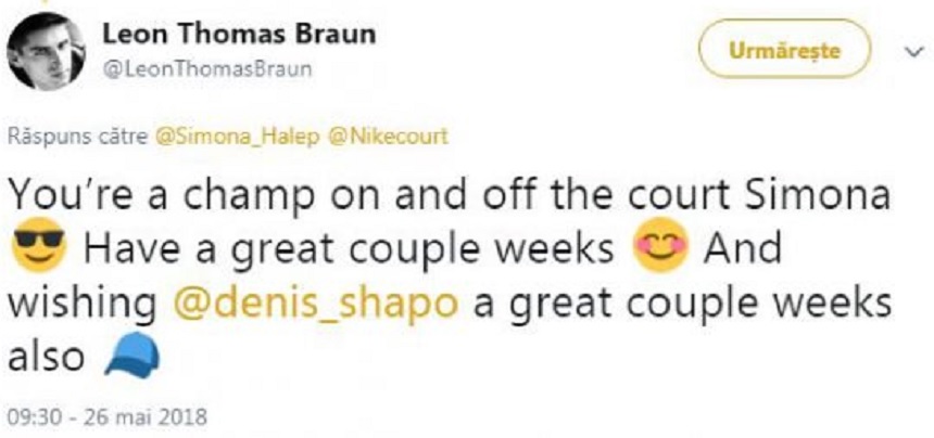 „Simona acordă cele mai pline de candoare interviuri pentru presă, dintre toţi sportivii. Bravo, Simona, bucură-te în continuare de ceea ce faci”, a scris pe rețeaua de socializare Leon Thomas Braun.
